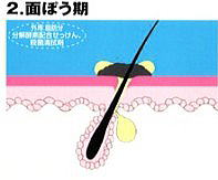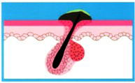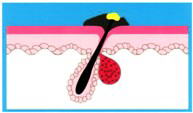 | ○思春期になるとホルモン(アンドロゲン)の働きが活発になって、皮脂腺が刺激を受け、皮脂が大量に分泌される。分泌された皮脂によって、毛こうが角化され狭くなり、皮脂が排出しにくくなる。 | ○皮脂に汚れやあか(角質)がつき、皮脂も酸化して、黒いポツポツ(面ぽう、comedo)ができる。毛のう中の皮脂は排出されずに溜まっていく。 | ○毛のうでは皮脂の好きなアクネかん菌が増殖し、アクネかん菌のリパーゼが皮脂を分解し、遊離脂肪酸が溜まっていく。そうすると毛のう壁が刺激され、組織が壊れて炎症が起きてくる。 | ○アクネかん菌やブドウ球菌などによって化膿する。化膿がひどくなると皮膚の奥深くまで傷をつけてしまい、治るまで時間がかかる。治癒後にあとが残ることがある。 |