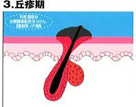 | ●お湯で1日3〜4回、脂肪分解酵素配合せっけん又は洗顔料で洗顔し、皮脂を洗い流します。 | ●洗顔後は、軟らかい殺菌清拭剤(オードムーゲH)でアクネかん菌を殺菌します。 | ●赤く盛り上がったニキビには、イオウ製剤(ロイドキープS)をニキビの頭につけ、毛のうの皮脂を排泄します。 | ●化膿しているときは抗生物質製剤(ゲンタマイシンなど)を塗って殺菌します。 | |