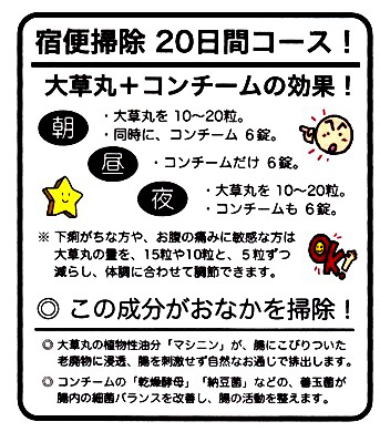 腸内の滞留便(宿便)の排出は体質にもよりますが、平均7〜14日程で、いつもの排便とは違う「黒っぽい便」や「臭い便」が排出されます。さらに服用を続けると数日後に又同じような排便があります。ほとんどの方が20日間を過ぎると、通常の便だけになり一段落します。腸内細菌バランスの回復や腸管活動が完全に回復するには数ヶ月から半年、長い方では年単位が必要になりますので、コンチームなどの整腸剤はその後も服用をお続けになることと、宿便掃除「20日間コース」を、春と秋の年2回など、定期的に実施されることをお奨めします。 |